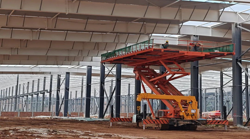 The floor for this steel workshop building is designed to be 300mm thick graded crushed stone + 200mm thick C30 concrete, and total floor area is about 130,000 square meters. In the early stage, a small tamping machine was used to compact the foundation column foot, and the soil was repeatedly rolled and graded into a board; the compartment diagram was planned and the slump of commercial concrete was strictly controlled; armored seams, infrared laser ultra-flat radiometers, SXP precision laser paving and leveling machines, diamond abrasive spreading machines, and timely seam cutting within 24 hours were used.